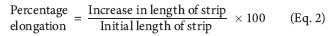 Procentuell förlängning. När stress appliceras sträcker sig ett filmprov, och denna spänning benämns belastning. Strain är i grunden deformationen av filmen dividerad med provets ursprungliga dimension. När mjukningsmedelsinnehållet ökar observeras filmförlängningen.