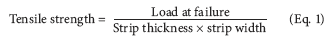 Brottgräns. Draghållfasthet är den maximala spänningen som appliceras på en punkt där remsprovet bryts. Det beräknas med den applicerade belastningen vid brott dividerad med tvärsnittsarean för remsan som anges i ekvationen nedan: